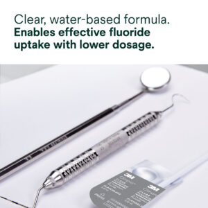 3M™ Clinpro™ Clear Fluoride Treatment is a water-based, rosin-free formula that’s ready to apply and provides protection to enamel and dentin surfaces. This fluoride treatment features a ready-release formula that enables effective fluoride uptake with a minimum contact time of just 15 minutes, making it easy for your patients to say “yes”.
